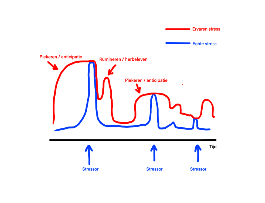 presenteren leuk vind, was het behoorlijk spannend om voor mijn mede-leraren-in-opleiding een verhaal te houden. Wat voor vragen zouden ze hebben? Is mijn verhaal niet te wetenschappelijk? Is het wel interessant genoeg? Het praatje ging gelukkig goed en er werden veel vragen gesteld achteraf, wat ik als een goed teken opvatte. Eén vraag die speelde die ochtend was: waarom zijn we met z’n allen zo gestresst? En wat kunnen we eraan doen? Het is bekend uit wetenschappelijke studies dat stress op zich niet ongezond is, behalve als het te vaak voorkomt en je tussendoor niet goed herstelt. Dan wordt het lichaam langzaam uitgeput en gaan veel biologische processen zich aanpassen, bijvoorbeeld door veranderingen in hersenverbindingen of veranderingen in de receptoren van stress hormonen. Het opnieuw ‘inregelen’ van het stress systeem verandert je dus, en dat is vaak niet ten goede. Maar, zoals gezegd, door voldoende tijd voor herstel te nemen kunnen we dit voorkomen. Maar mijn ervaring is dat ik in het weekend nog steeds (in mijn hoofd) bezig ben met de dingen die mij doordeweeks stress geven. Daar zit ‘m volgens mij de moeilijkheid: in het piekeren en het herbeleven van ervaringen. Een definitie van stress is: stress is de subjectieve ervaring van het waarnemen van echte en ingebeelde bedreigende veranderingen in de omgeving die vragen om directe verandering in gedrag en aanpassing van toekomstig gedrag. Dus ook bedreigingen die je je inbeeldt geven een lichamelijke reactie (stress respons). In een online serie van lezingen over burn-out1 liet Sabine Geurts dit mooi zien in een grafiek - zie onderaan. Mensen (in tegenstelling tot dieren, die ook stress hebben) zijn bij uitstek goed in het verlengen van een stressvolle gebeurtenis, door er voorafgaand over te piekeren en het achteraf nog eens her te beleven. De echte stress (de gebeurtenis zelf) wordt dan verlengd in onze gedachten en omdat ingebeelde stress ook