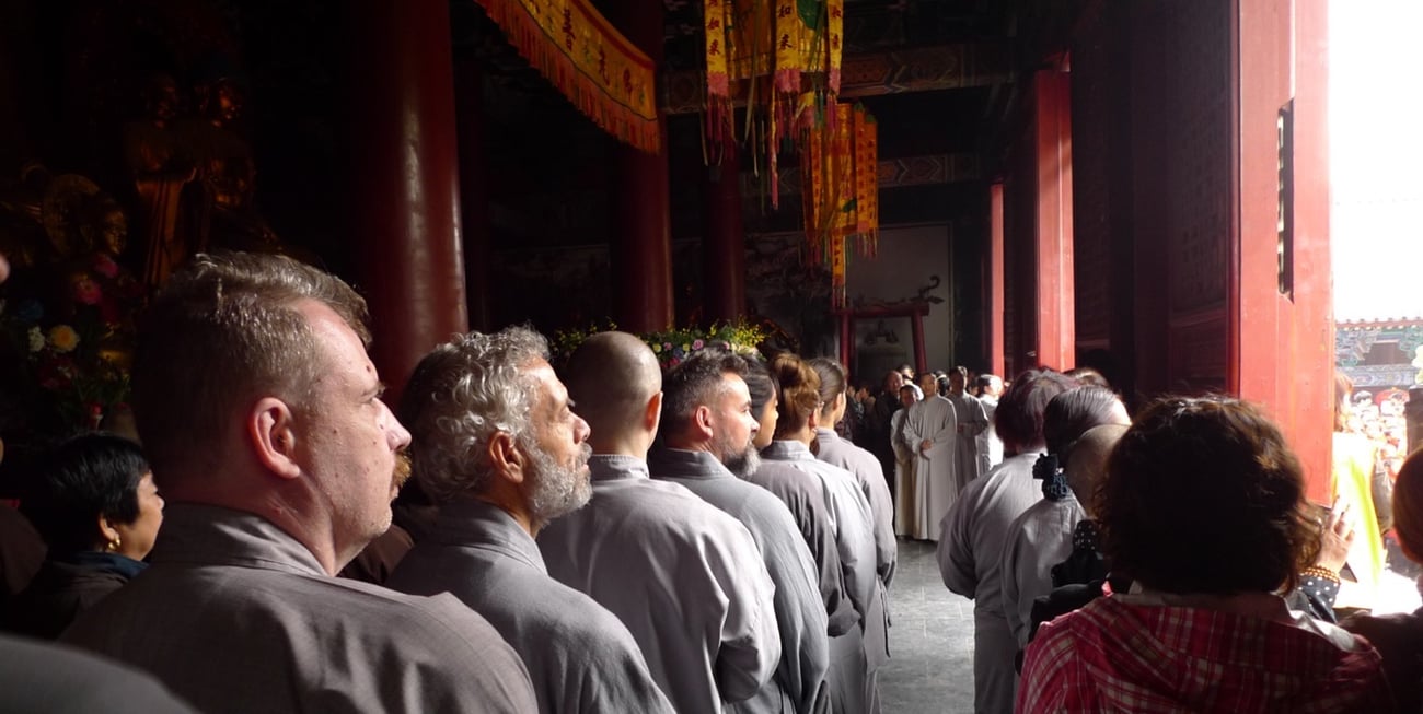 Op een doordeweekse late ochtend werd onze groep International Disciples opgetrommeld om deel te nemen aan de verjaardags-ceremonie op het tempelterrein. Om 13.00 werden we verwacht vlak naast de Grand Buddha Hall. In vol ornaat! Dus shagua + dagua.