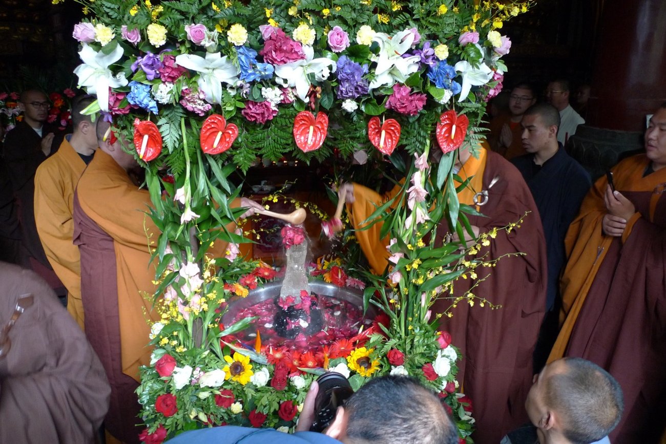 Monniken zongen sutra’s (linkje audio onderin) en na enige tijd bewogen zich de rijen heel langzaam voorwaarts. Toen mochten we één voor één een glazen beeldje overgieten. Bathing the baby Buddha. Met een houten soeplepel. Het vocht rook naar hartige bouillon. Bij deze handeling spreekt men in stilte voor zichzelf een goed voornemen uit (of drie).