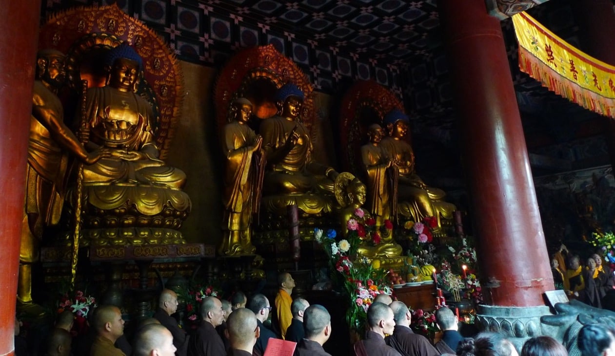 We liepen mee in een optocht waarna we de wacht hielden in lange rijen in de Grote Boeddhazaal. Om ons heen werd een aandachtsvolle stilte in acht genomen, die enkel doorbroken werd door een uitzonderlijk grote bel die elke 15s van ver klonk. Buiten de zaal hadden zich vele honderden belangstellenden verzameld en ook zij hielden hun onderling geroezemoes beperkt. Je kent het misschien zelf uit eigen ervaring: dit is zo’n alertheid die intuïtief in je opwelt zodra je voelt dat je een deel vormt van een grotere beweging. Eenheidsbewustzijn vult je vezels (4 mei om 20.00 kan een vergelijkbaar moment zijn in Nederland).