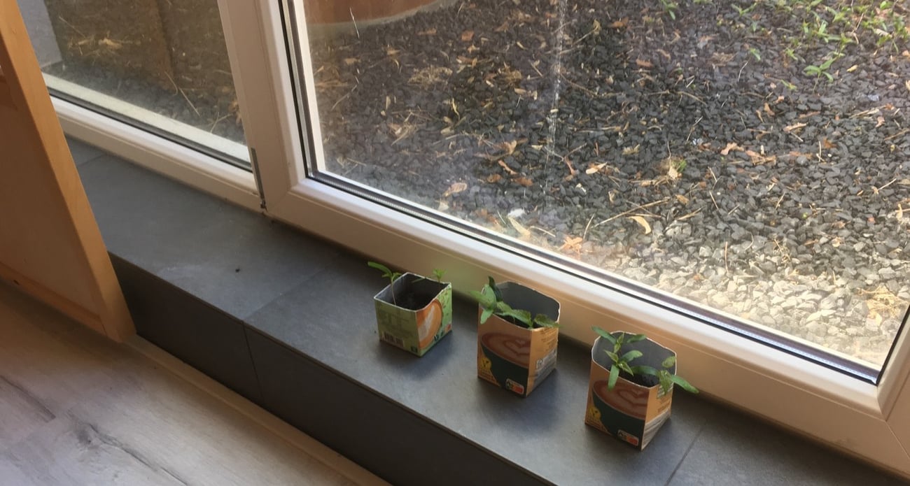 Je kunt ook bakjes (of afgeknipte melkpakken) gevuld met potgrond meebrengen en er zelf enkele spruiten insteken — en mee terugnemen, of achterlaten voor een ander. Die mogen in de komende weken in de vensterbank (tussen schuifdeuren en tuindeur).
